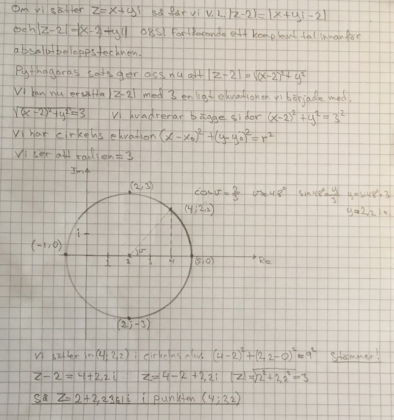 "Ekvationen har då lösningarna "alla tal som ligger på avståndet 3/2 från talet 1i". Dessa tal ligger på en cirkel med radie 3/2 runt talet 1i, eftersom dessa är de enda talen som ligger på avståndet 3/2 ifrån talet 1i.
