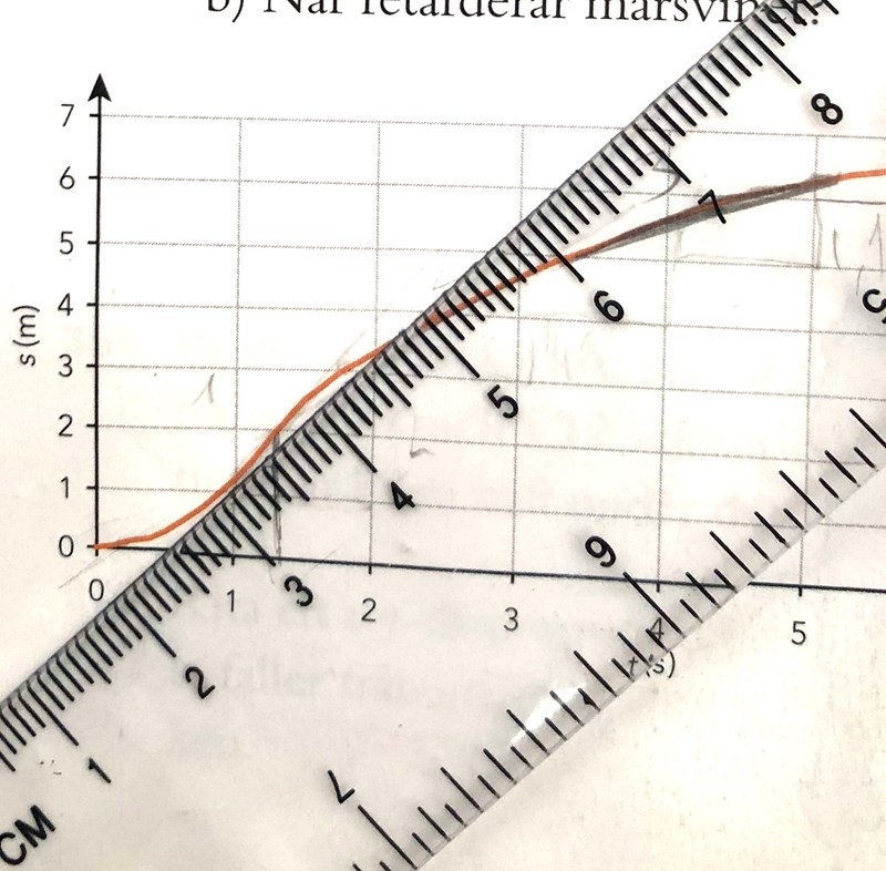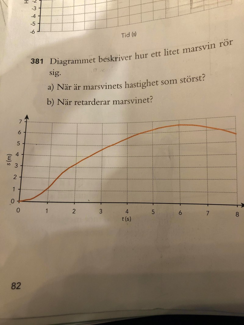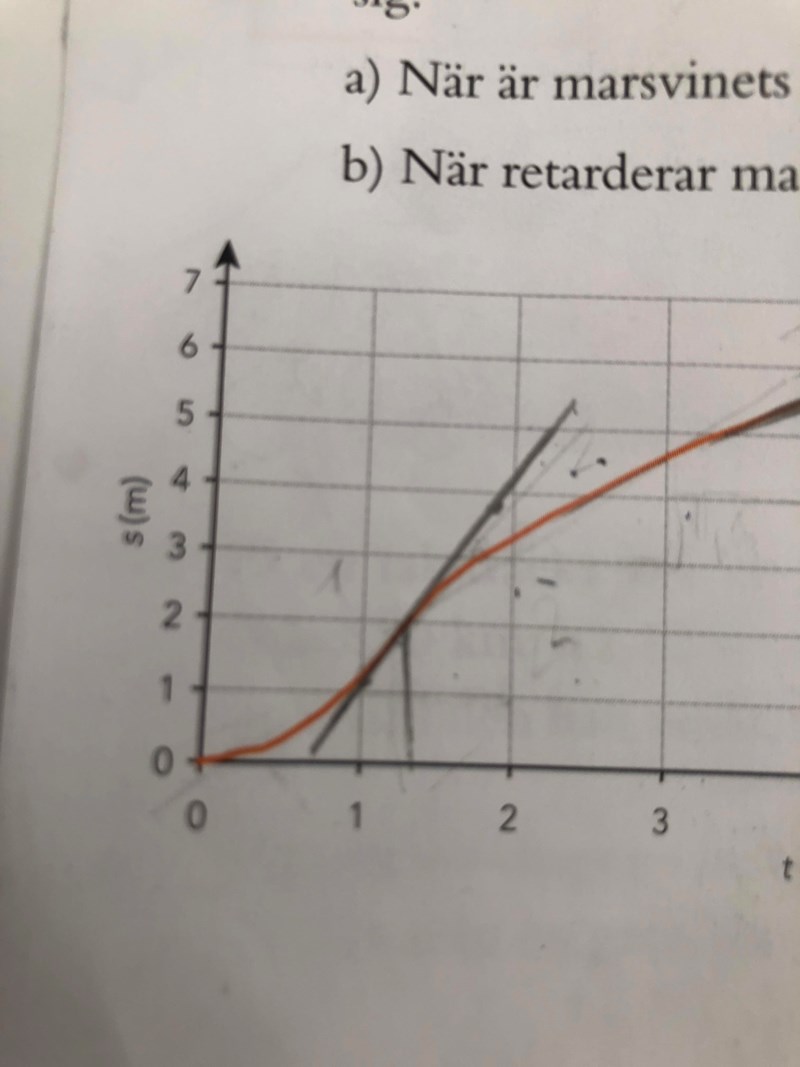 Jag inte förstår hur marsvinets högsta hastighet är i 1.2 s . Och hur marsvinet ”retarderar” i b uppgiften från 1.2 s till 6 s . Grafen stiger upp efter ca 1.2 s , hur kan marsvinet retardera då?