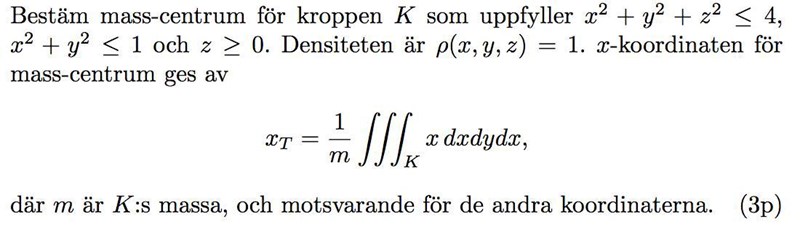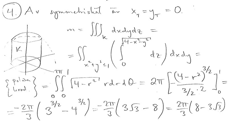 För x och y så är området symmetriskt kring z-axeln. Det blir som i envariabelfallet att integrera en udda funktion på ett symmetriskt intervall, integralen blir 0.
