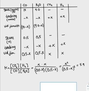 hej, jag har fastnat på den har frågan. Jag har först räknat substansmängden CO och H2O sedan kan jag inte försätta. Jag tänker att det finns +X mol CO2 men jag kommer inte fram till nån uttryck för vätgas. Kan någon förklara hur jag ska gå vidare