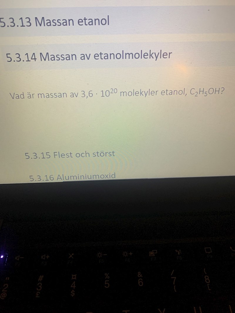 Det enklaste är att omvandla 3,6*1020 molekyler till mol genom att du vet att 1 mol motsvarar 6,022*1023 molekyler. När du vet substansmängden i mol kan du räkna ut massan med hjälp av molmassan för etanol.
