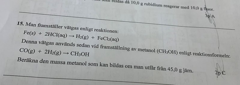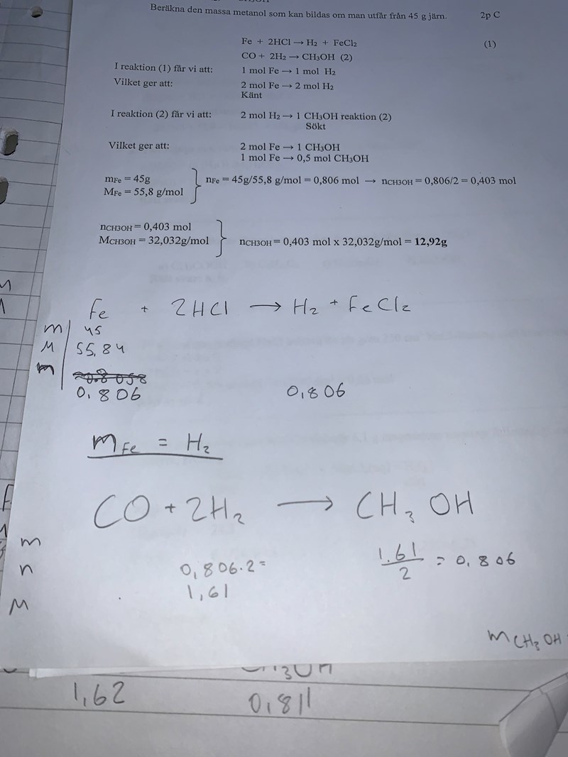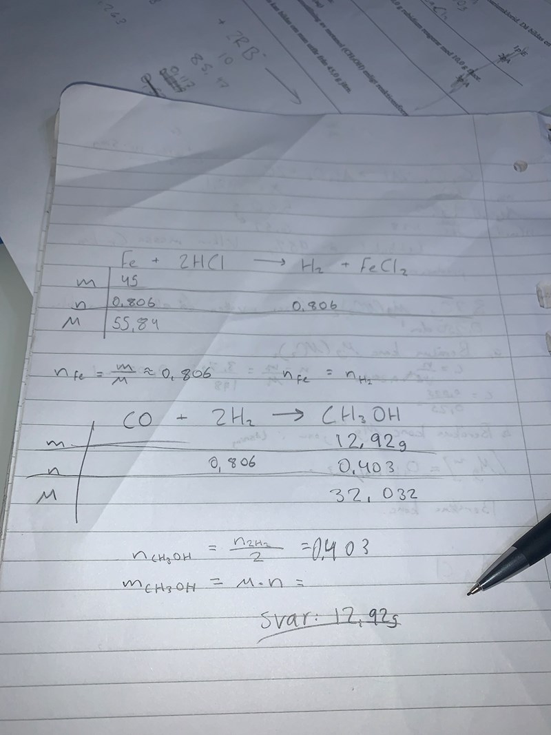 I uppgiten så vill man få reda på på massan metanol som bildas om man har 45 g järn. Jag tänkte att man måste då räkna ut substansmängden för väte eftersom den finns i båda reaktionerna. o substansmängden för väte i reaktion 1 blir ju samma som substansmängden för järn eftersom molförhållande är 1:1.