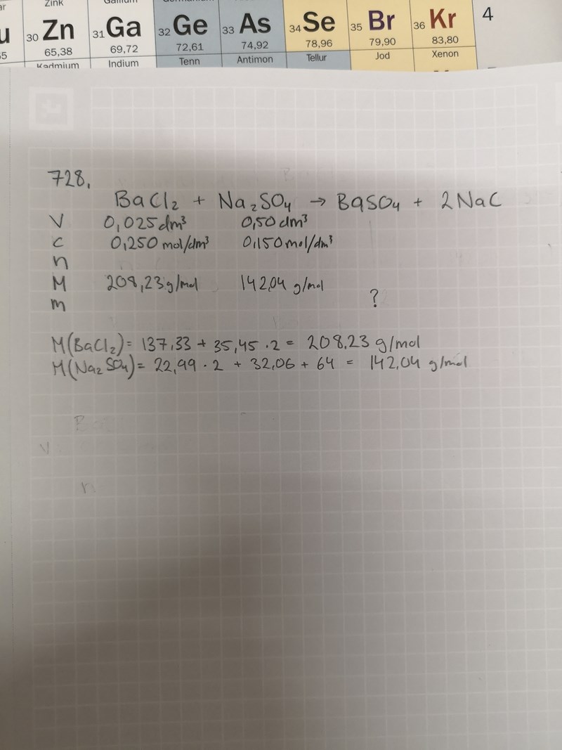 Tack! Räknade nu ut n för allt i Högerled eftersom det e lika med summan av massorna på VL. Men hur får man fram just BaSO4s massa?
