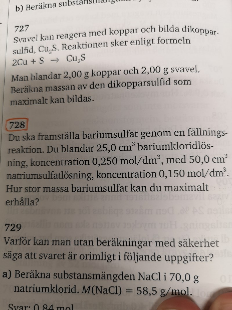 Smaragdalena skrev:Vilket svar fick du fram? Det kanske finns nånstans i alla dina uträkningar, men det syns inte tydligt. Du bör ha en rad nederst med "Svar: Man kan maximalt erhålla ... g bariumsulfat."