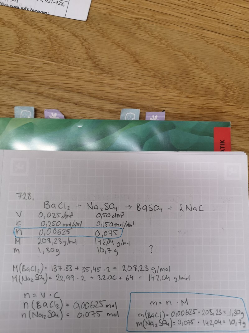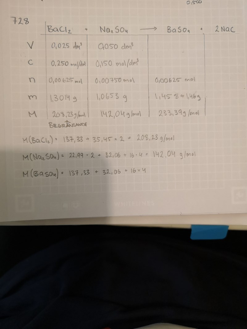 Tack för tipset, ja blir lätt rörigt med dessa tabeller men under m för BaSO4 skrev jag att det blir 1.46 g :)