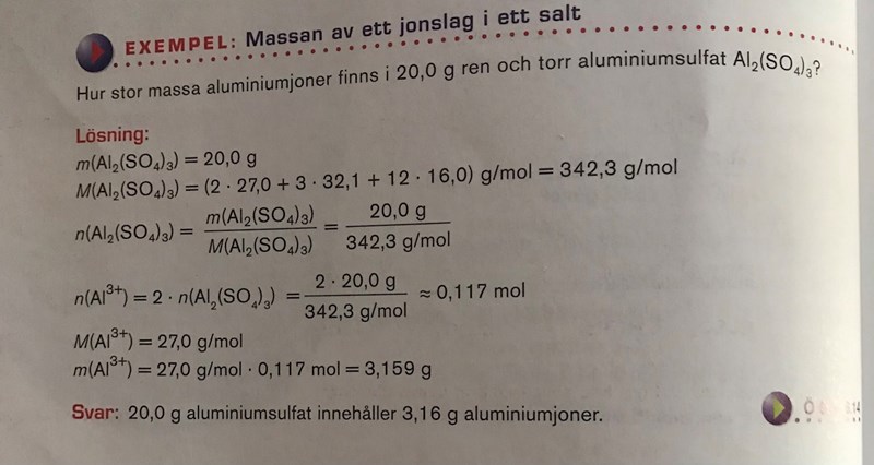 I steg 1 anges massan, i steg 2 anges molmassan. I steg 3 beräknar mansubstansmängden för aluminiumsulfat. Sedan i steg 4 påstår man att om man multiplicerar aluminiumsulfats substansmängd med 2 får man substansmängden för enbart en aluminiumjon (n(Al3+)) Hur kommer det sig ?????????