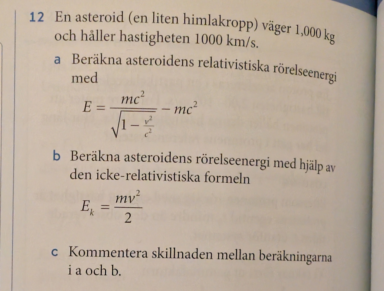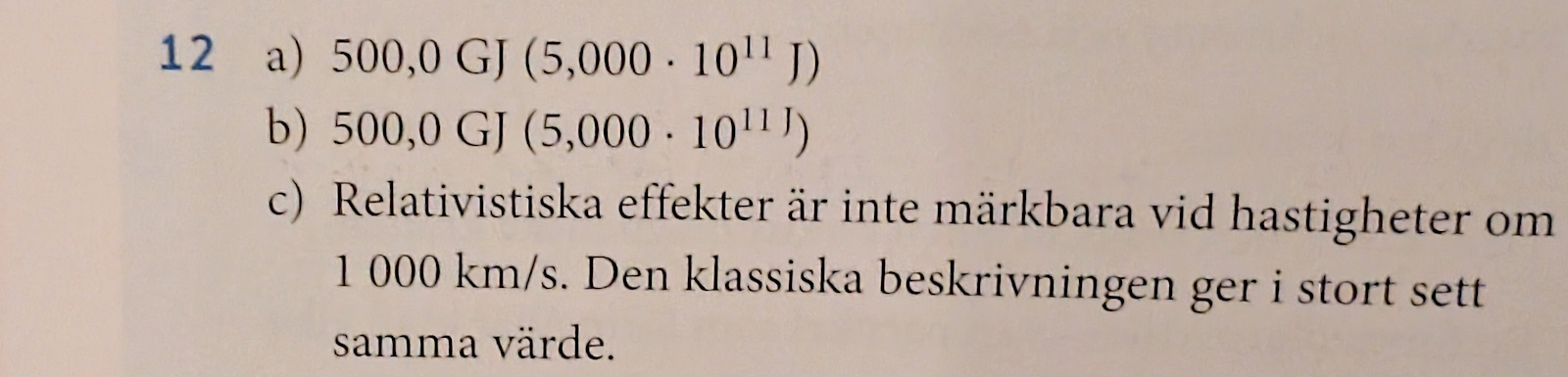 Del b av frågan vill att man ska räkna med formeln E=(mv^2)/2 och då får jag också nästan samma svar för att den formeln visar lite annorlunda svar men det blir också 5,0*10^14 J när man avrundar så jag antar att de fel i Facit? (dubbel kollade facit och det ska bli 5,0*10^11 J eller 500 GJ på både a och b delen).