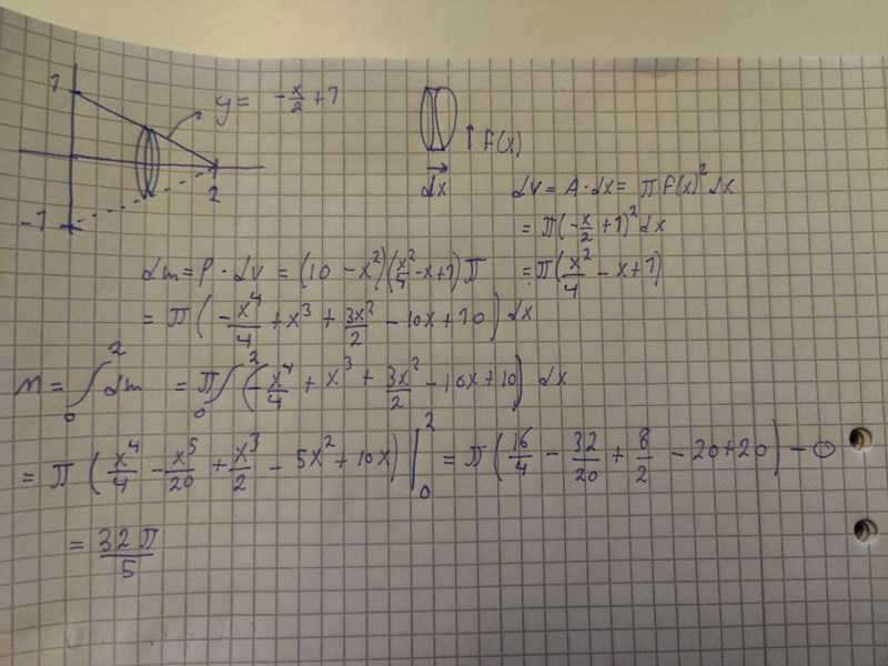 "En rak cirkulär kon med höjden 2m och radien 1m har spetsen nedåt och är fylld med en vätska. I ett plant snitt parallellt med konens bottenyta och på avståndet x m från konens spets är vätskans densitet (10-x^2) kg/m^3. Bestäm vätskans totala massa"