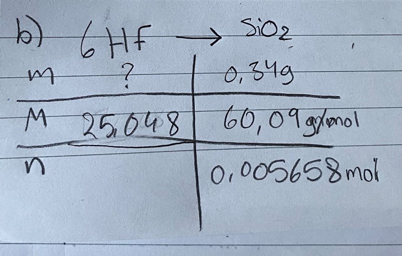 6 mol HF är ekvivalent med 1 mol SiO2, så 6*0,005658 mol HF är ekvivalent med 0,005658 mol SiO2.