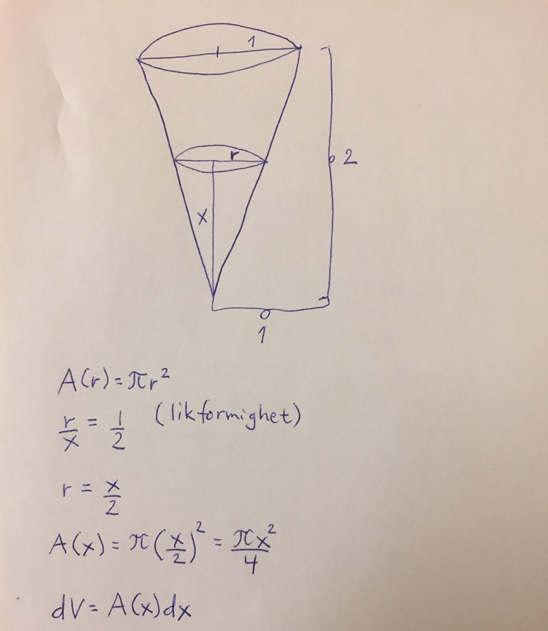 Arean för ett plant snitt måste ju bero på var i konen (på vilken höjd) du befinner dig.
