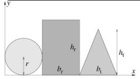En cirkulär platta med radie r = 0,8526 m ligger intill en rektangulär platta med bas br = 0,943 m och höjd hr = 0,960 m som ligger intill en triangulär, likbent platta med bas bt = 2,00 m och höjd ht = 0,7581 m. Plattorna ligger på en gemensam baslinje och origo är i nedre vänstra hörnet, se figur.