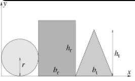 En cirkulär platta med radie r = 0,728 m ligger intill en rektangulär platta med bas br = 0,932 m och höjd hr = 0,9834 m som ligger intill en triangulär, likbent platta med bas bt = 1,45 m och höjd ht = 0,974 m. Plattorna ligger på en gemensam baslinje och origo är i nedre vänstra hörnet, se figur.