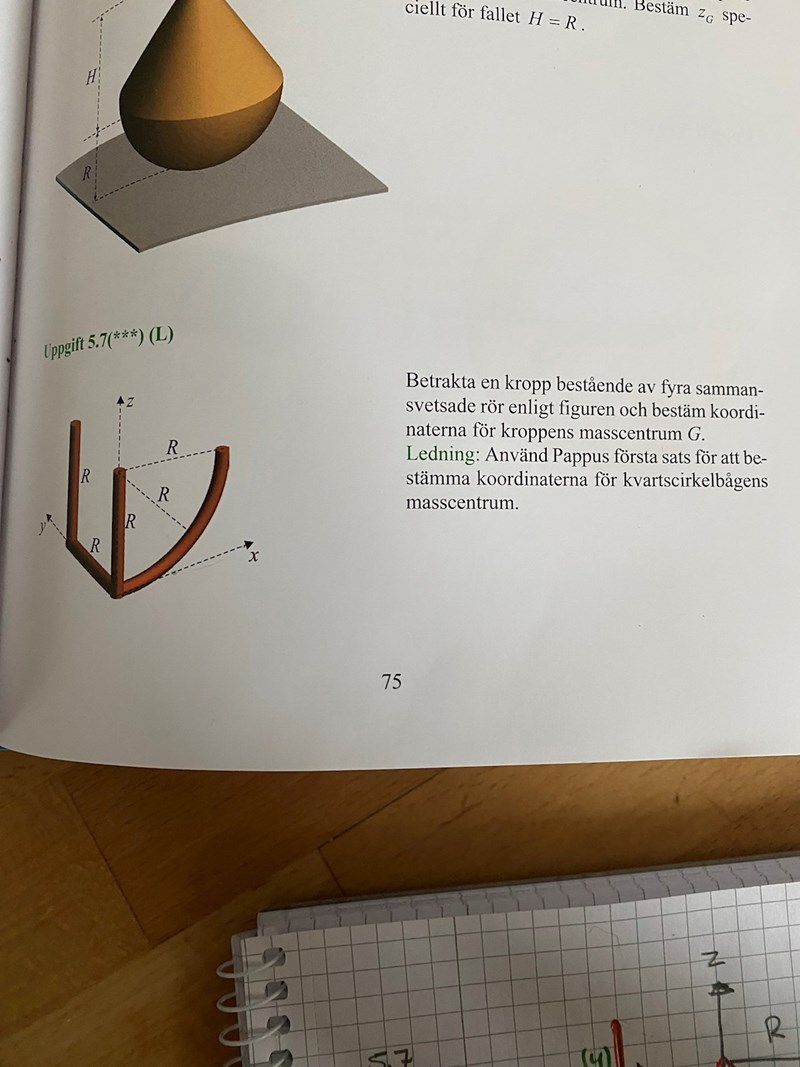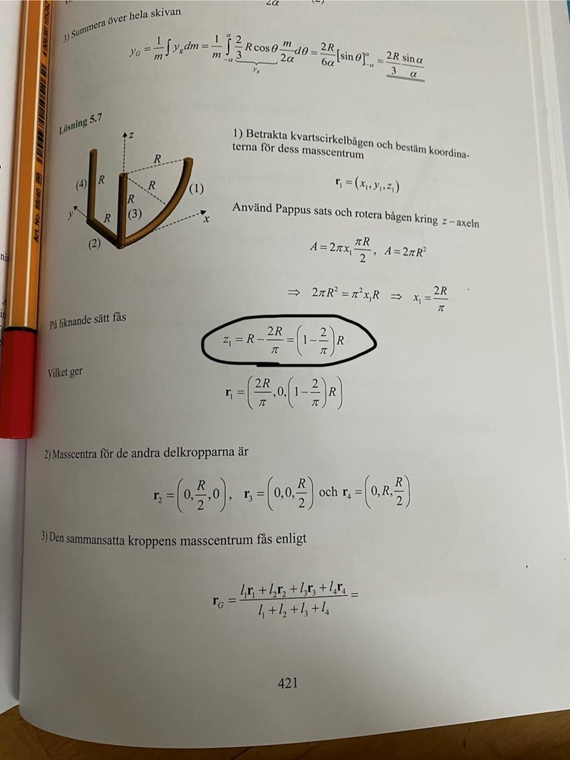 PATENTERAMERA skrev:Pga av symmetri så ligger masscentrum någonstans på linjen som definieras av y =0 och x + z = R. Du vet x-koordinaten och kan därför räkna ut z-koordinaten.