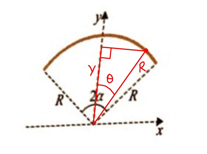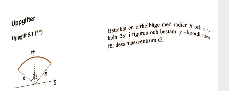 Jag började med standard , jag ville därefter definiera dm i andra termer så jag använde mig av att objektet har en längddensitet. Detta ledde till , jag har än så länge endast använt mig av enkel cirkelsektor geometriska samband så har svårt att tro att detta är fel. Efter att jag förenklat och definierat yg med Rsin: . Jag känner fortfarande att detta borde vara korrekt, men efter detta känns allt väldigt suddigt. Att jag definierat integralen mellan 0 och inser jag är mycket fel men vet inte hur jag annars ska definiera det.