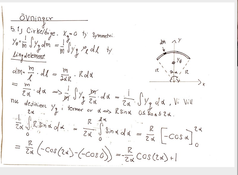 Jag började med standard 1mygdm, jag ville därefter definiera dm i andra termer så jag använde mig av att objektet har en längddensitet. Detta ledde till 1mygm2αdα, jag har än så länge endast använt mig av enkel cirkelsektor geometriska samband så har svårt att tro att detta är fel. Efter att jag förenklat och definierat ymed Rsin: R2αsinαdα. Jag känner fortfarande att detta borde vara korrekt, men efter detta känns allt väldigt suddigt. Att jag definierat integralen mellan 0 och 2α inser jag är mycket fel men vet inte hur jag annars ska definiera det.