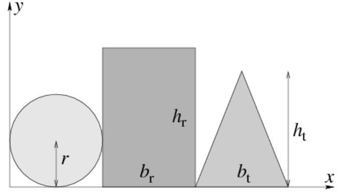 En cirkulär platta med radie r = 0,73 m ligger intill en rektangulär platta med bas br = 0,702 m och höjd hr = 0,864 m som ligger intill en triangulär, likbent platta med bas bt = 1,756 m och höjd ht = 0,7245 m. Plattorna ligger på en gemensam baslinje och origo är i nedre vänstra hörnet, se figur.