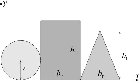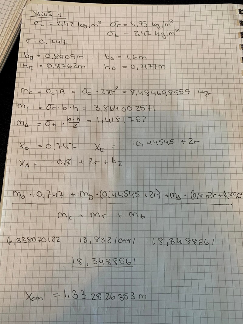 En cirkulär platta med radie r = 0,747 m ligger intill en rektangulär platta med bas br = 0,8909 m och höjd hr = 0,8762 m som ligger intill en triangulär, likbent platta med bas bt = 1,6 m och höjd ht = 0,7177 m. Plattorna ligger på en gemensam baslinje och origo är i nedre vänstra hörnet, se figur.Bestäm de tre plattornas gemensamma tyngdpunkt i x-led om plattorna har ytdensitet σc = 2,42 kg/m², σr = 4,95 kg/m² och σt = 2,47 kg/m².