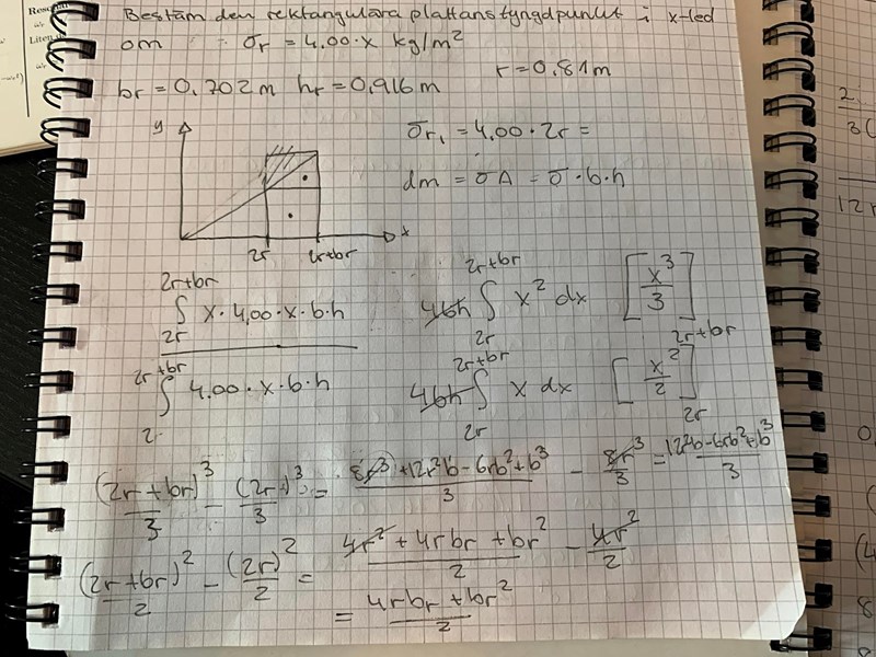 En cirkulär platta med radie r = 0,81 m ligger intill en rektangulär platta med bas br = 0,702 m och höjd hr = 0,916 m som ligger intill en triangulär, likbent platta med bas bt = 1,62 m och höjd ht = 0,88 m. Plattorna ligger på en gemensam baslinje och origo är i nedre vänstra hörnet, se figur.Bestäm den rektangulära plattans tyngdpunkt i x-led om dess ytdensitet varierar i x-led enligt σr = 4,00·x kg/m2.