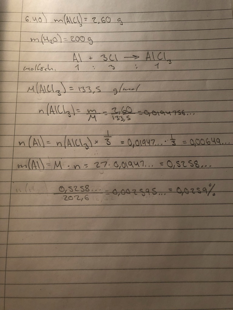 Substansmängden aluminiumklorid är 2,60/133,3 = 0,0195 mol. 1mol aluminiumklorid innehåller 1 mol aluminiumjoner, så substansmängden aluminiumjoner är också 0,0195 mol. 0,0195 mol aluminium har massan 0,0195.27,0 = 0,527 g. Masshalten är 0,527/202,6 = 0,00260 = 0,260 %, som facit säger.