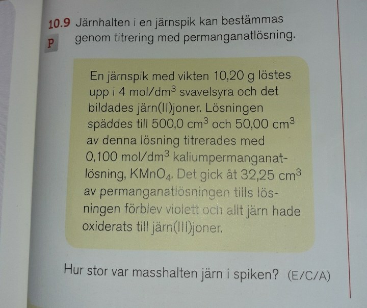 SvanteR skrev:Du har först 500 kubikcentimeter lösning. Sedan tar du 50 kubikcentimeter och använder till titreringen. Men du vill ju veta hur mycket järn du hade i den ursprungliga lösningen, och den hade ju 10 gånger så stor volym. Dvs 500/50 = 10.