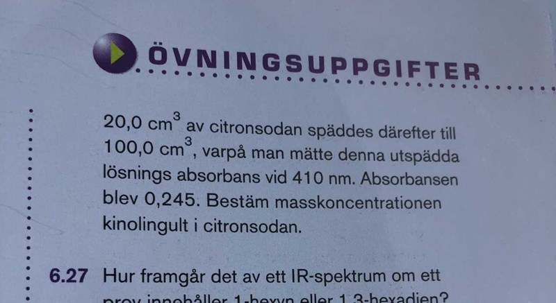 Gör en standardkurva. Använd denna för att bestämma koncentrationen av kinolingult i den utspädda läsken. Beräkna sedan koncentrationen av kinolingult i den outspädda läsken.
