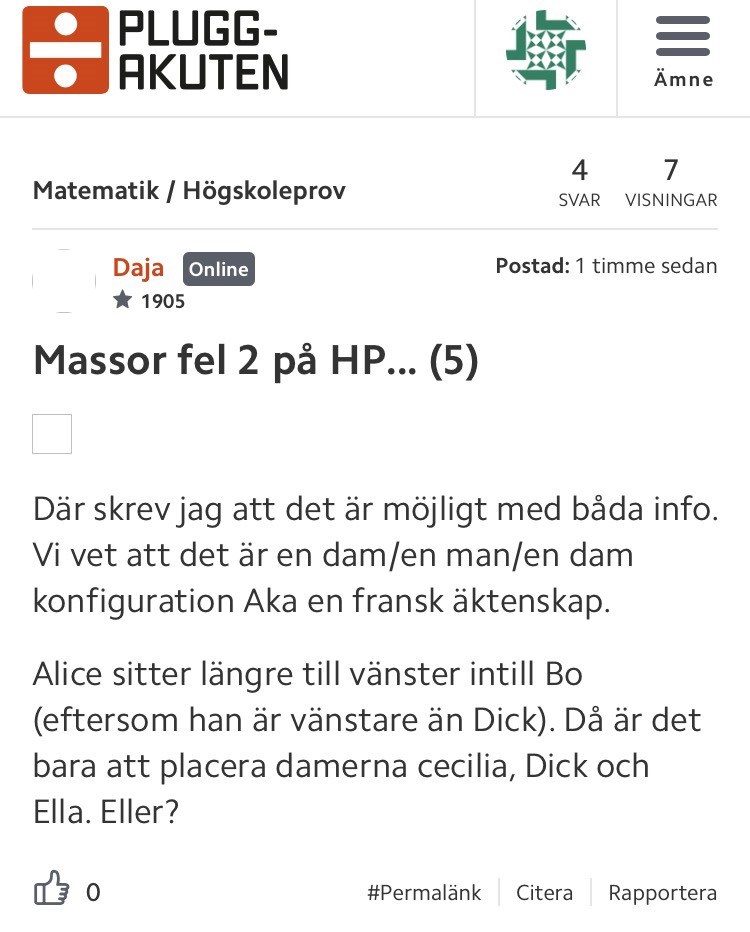 Alice sitter längre till vänster intill Bo (eftersom han är vänstare än Dick). Då är det bara att placera damerna cecilia, Dick och Ella. Eller?
