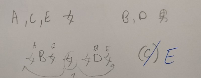 Så vi kan inte veta i vilken ordning de sitter. Det står inte att C är till höger om E eller tvärtom.