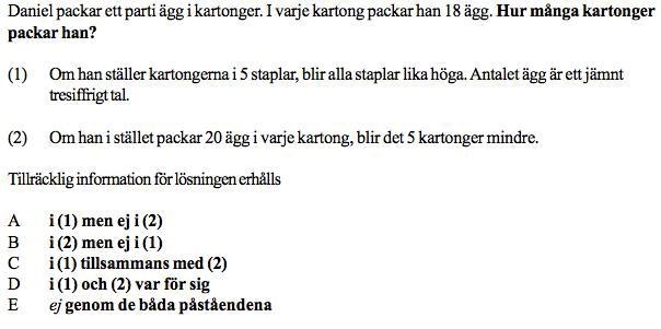 Från (2) kan du ställa upp ekvationen 18x = 20(x-5), där x är antalet kartonger.