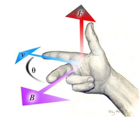 Men riktningen på den magnetiska kraften, som kommer från magnetfältet, måste man använda en högerhandsregel för att lista ut. Skilj alltså på magnetfältets- och det elektriska fältets verkan på partikeln!