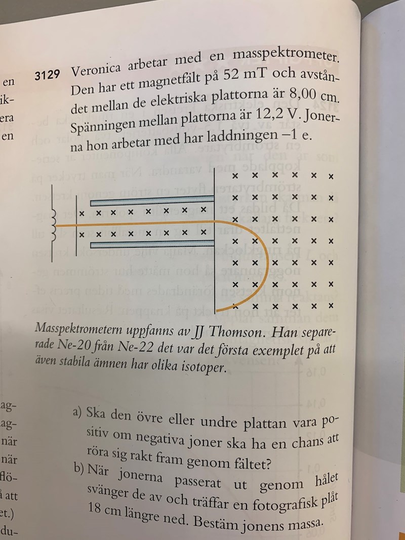 Veronica arbetar med en masspektrometer. Den har ett magnetfält på 52 mT och avståndet mellan de elektriska plattorna är 8,00 cm. Spänningen mellan plattorna är 12,2 V. Jonerna hon arbetar med har laddningen −1 e. Ska den övre eller undre plattan vara positiv om negativa joner ska ha en chans att röra sig rakt fram genom fältet?Fattar inte varför svaret är den övre plattan? Vet att de ska till den positiva plattan då de repelleras med den negativa plattan.