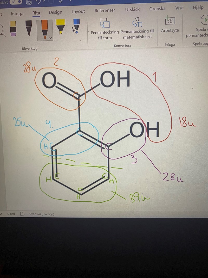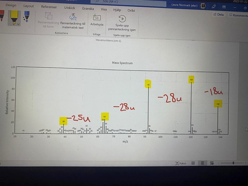 Hej! Håller på med en uppgift som lyder ”vad är detta?”, som går ut på att ta reda på vilket ämne man har tilldelats (kvalitativt). Vi kom fram till den funktionella gruppen karboxylsyra under en laboration och tror att det kan vara salicylsyra. Detta jämför vi med ett masspektrum och vi har ringat in de delar i salicylsyra som motsvarar specifika massor samt i vilket steg som vi tror att just de delarna bryts bort. Slutligen tror vi att en halv bensenring återstår. Är det vi kommit fram till troligt?