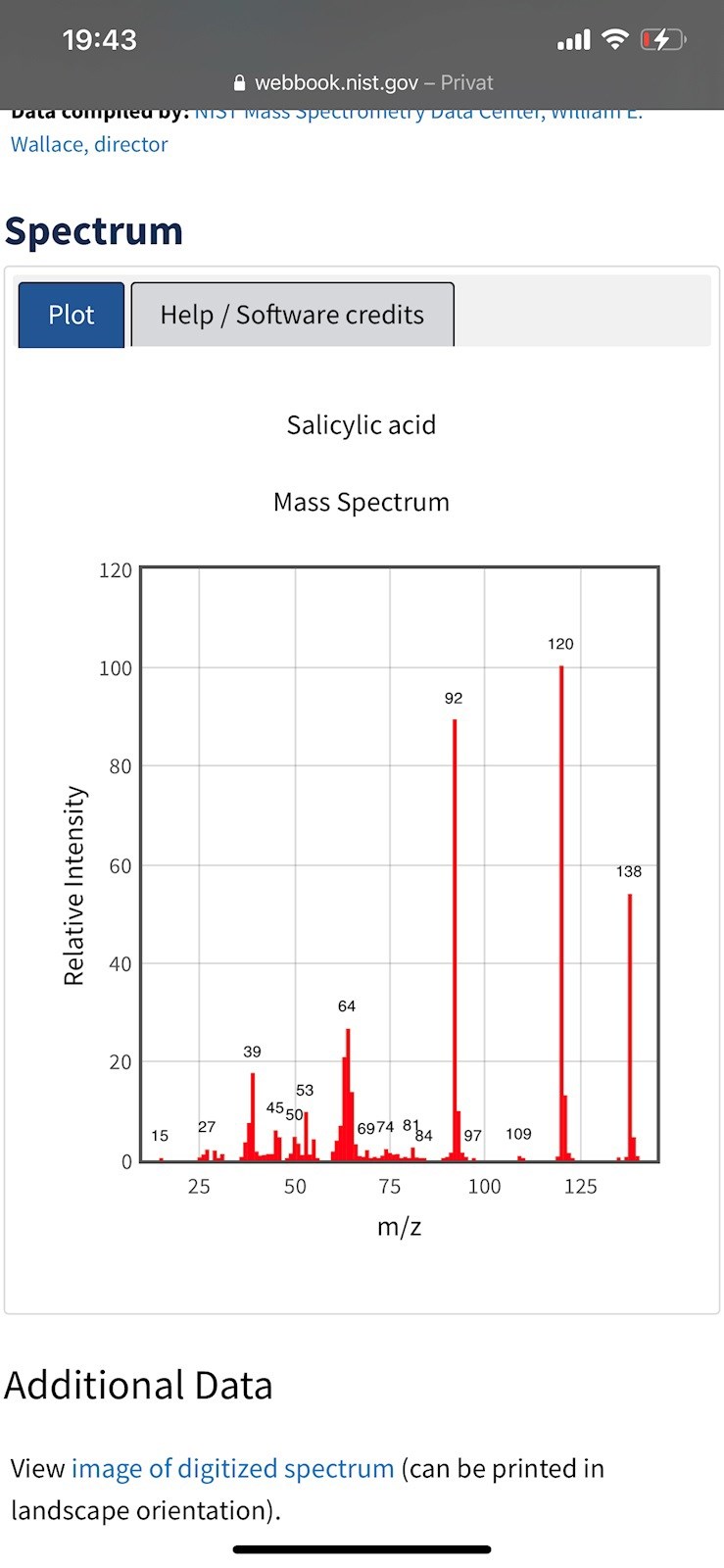 Hittade nyss en bild av masspektrum av salicylsyra på internet och såg att det överrensstämmer. Nu behöver jag bara förstå vilka delar som bryts bort och när. (Ifall det jag kommit fram till innan är rätt)
