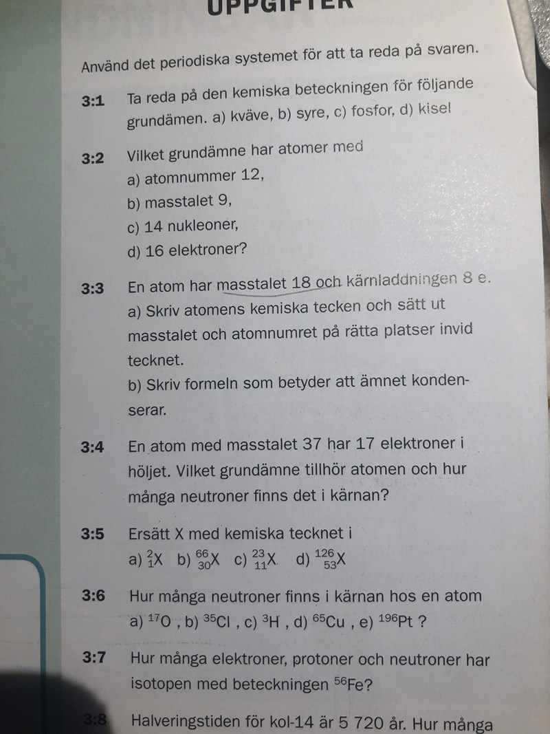 I en liknande uppgift står det ” använd det periodiska systemet för att ta reda på vilket grundämne som har masstalet 9”