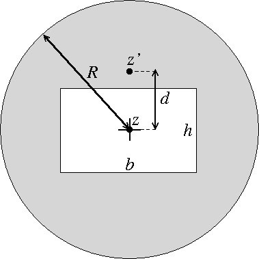 En homogen cirkulär skiva med radie R = 5,07 m och tjocklek t = 11,0 ·10-3 m roterar kring z-axeln (vinkelrät mot skivan, se figur). Ur skivans mitt är skuret ett rektangulärt hål med basen b = 4,9 m och höjden h = 4,72 m.