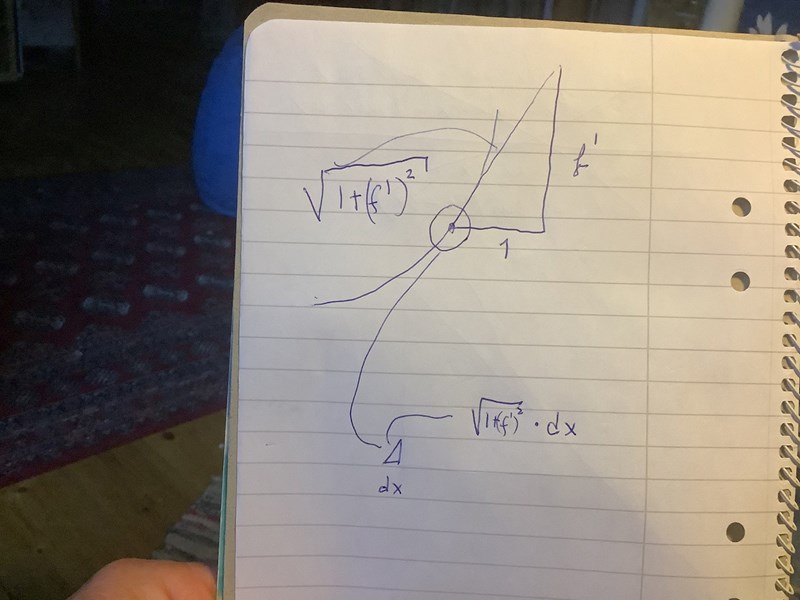 Hur gör vi när vi integrerar fram en kurvlängd? Jag kommer inte ihåg härledningen, men om jag lägger en rätvinklig triangel där kurvan tangerar hypotenusans nedre vänstra hörn (och kateterna är axelparallella) så tänker vi att triangeln har horisontell katet 1. Då är vertikal katet f’ i punkten (jag struntar i + el –, tänker att kurvan går uppåt) och hypotenusan fås ur Pythagoras.