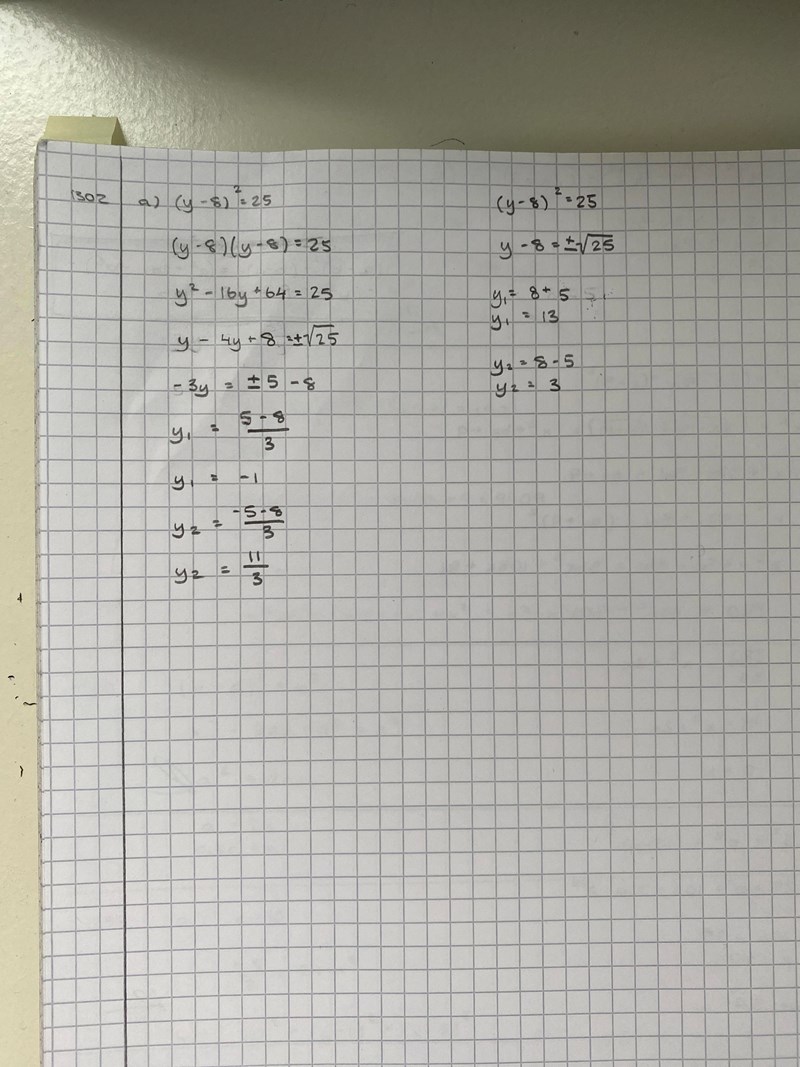 Rent spontant tänkte jag först lösa ut parantesen och får då svaret y²−16y+64. För att kunna ta roten ur (25 på andra sidan) måste först vad som är inuti parentesen lösas ut.