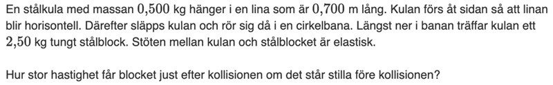 Laguna skrev:Den totala rörelseenergin bevaras också (för att stöten är elastisk). Så du kommer att kunna räkna ut kulans hastighet efter stöten också.