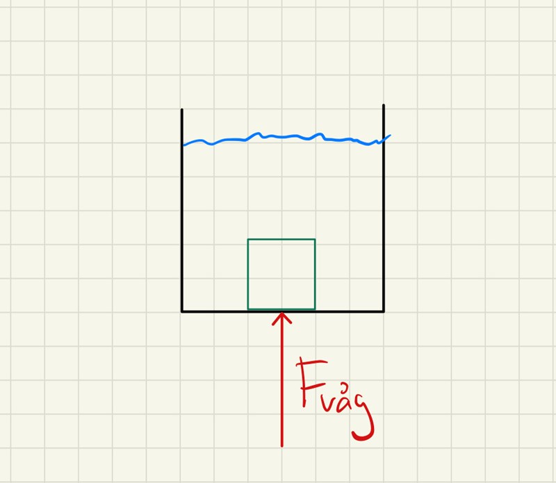 Men samtidigt så tänker jag, metallstycket kanske inte ens påverkas av någon lyftkraft när det står på botten av bägaren? Om vi tänker att metallstycket är ett perfekt rätblock med lena sidor, samt att metallstycket sitter perfekt platt mot bägarens botten, så kommer det inte kunna finnas någon lyftkraft eftersom lyftkraften saknar en "angripningspunkt" på metallstycket.