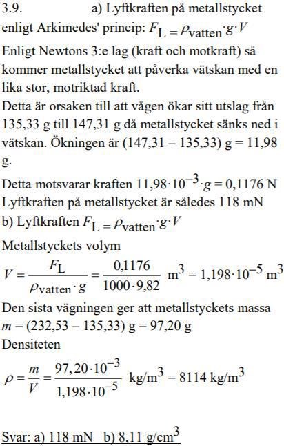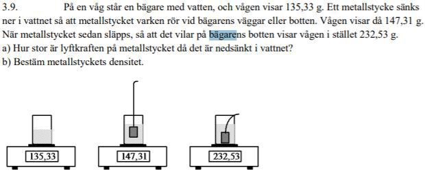 Hej! Jag förstår lösningen för fråga a). Men lösningsförslaget för b) förstår jag inte riktigt. Varför beräknar man massan av metallstycket genom att ta vågens utslag med metallstycket minus vågens utslag utan metallstycket, d.v.s. 232,53 g - 135,33 g? Det borde väl finnas en lyftkraft i den tredje bilden, och en motsvarande kraft som metallstycket trycker ner mot vattnet (Newtons tredje lag). Så då borde "232,53 g" inkludera både metallstyckets massa och den "massa" som kommer från lyftkraften. Men i lösningsförslaget har de ändå ju beräknat metallstyckets massa bara genom att ta 232,53 g - 135,33 g. Jag tycker man bör ta 232,53 g - 147,31 g.