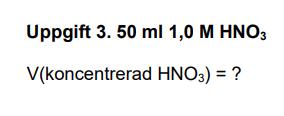 - Räkna ut hur stor volym av den koncentrerade lösningen som krävs för att få ut 0,05 mol salpetersyra.
