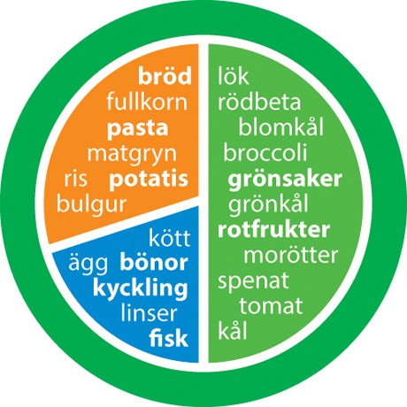 Matcirkeln har olika stora fält som du ser nedan som visar hur stor del av måltiden varje grupp bör utgöra. Det gröna ska utgöra ungefär hälften av måltiden. Det gula ska utgöra cirka 30 % av måltiden och det blåa ska utgöra cirka 20 % av måltiden. Så du får försöka uppskatta om denna fördelning stämmer ungefärligt på er måltid eller om ni kanske hade för mycket eller för lite av någon grupp om man ska följa detta.