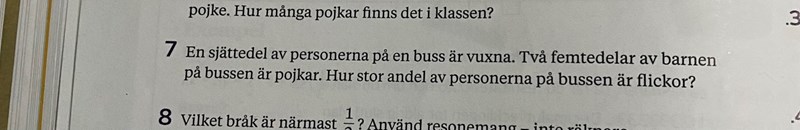 eftersom en sjätte del av personerna på bussen är vuxna så innebär det att resten är barn och utav denna rest så är två femtedelar pojkar. Först försök att ta reda på denna som jag berättade om innan.