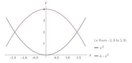 X^2 = 4 - x^2 => 2x^2 = 4 => x^2 = 2 => x = +- sqrt 2