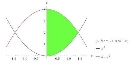 Jag har fått lösning på denna uppgift tidigare, men förstår inte varför man gör ett likamedstecken mellan x^2 och 4-x^2? Hur är dessa kopplade till varandra, och vad får vi ut som svar från att ha löst uppgiften?