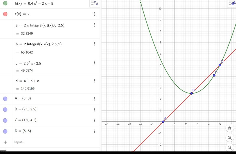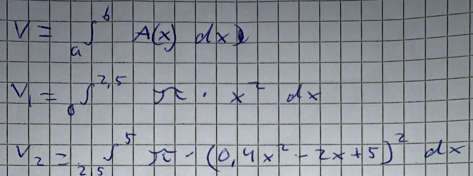 Hej jag förstår inte riktigt om jag ska lägga ihop tre volymer. Konen, Cylindern och skivmetoden. Är det rätt om man använder sig av skalmetoden med funktionen f(x)= 0,4x^2-2x+5 och sätter gränserna a=2.5 b=5. Sedan adderar ihop volymen för cylindern och konen?