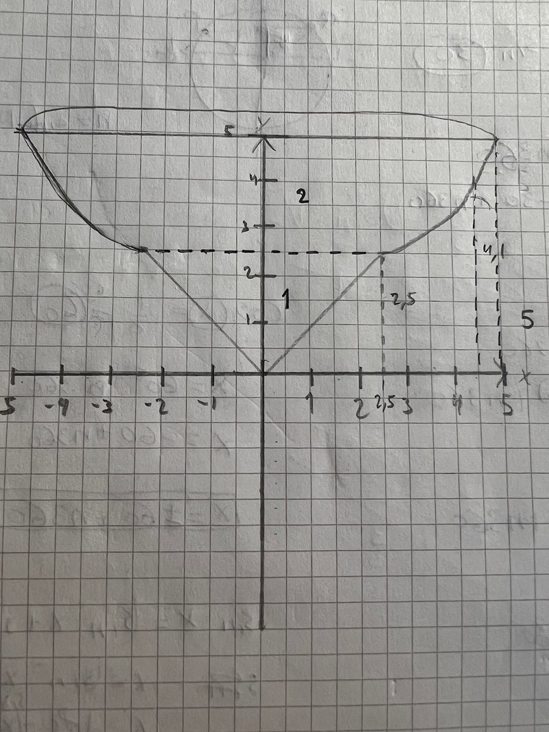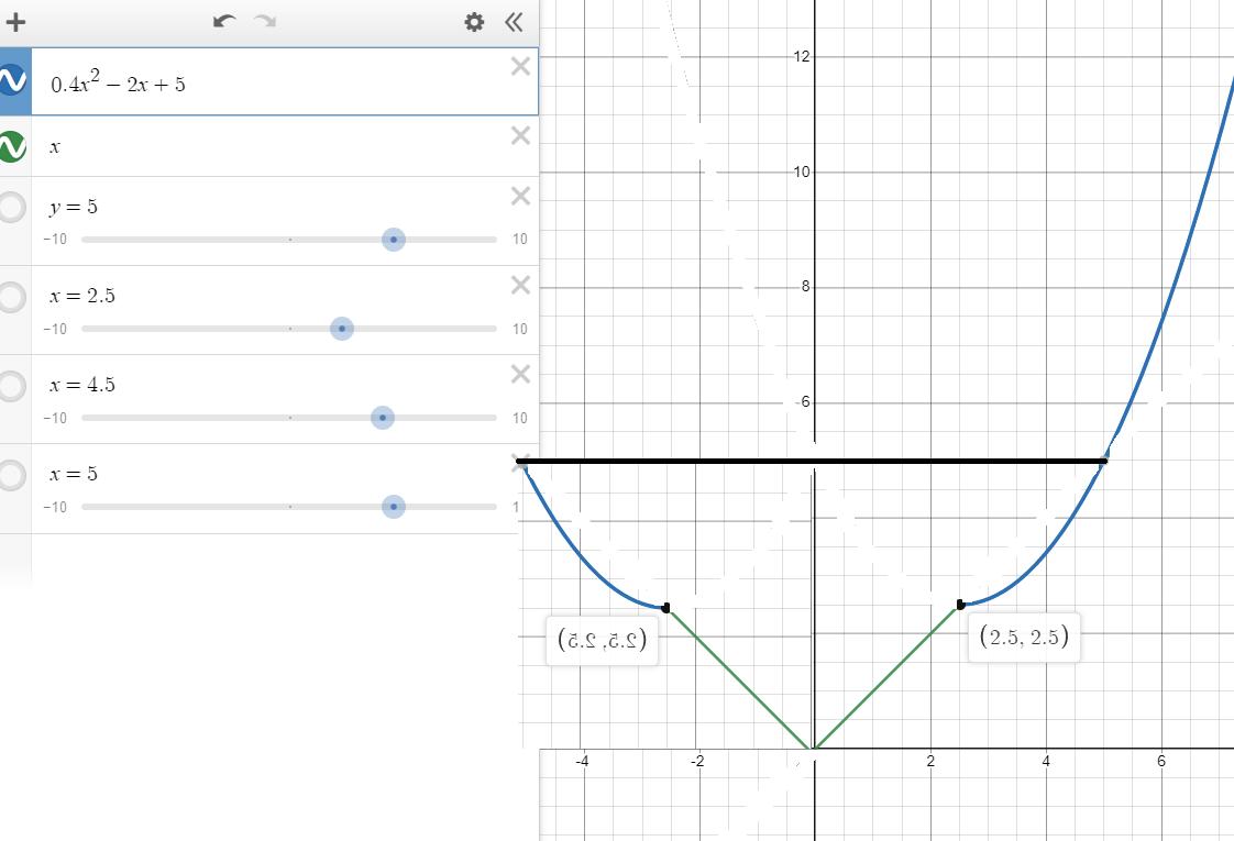 Nu har jag redigerat den lite i Microsoft paint så att det kanske är lite tydligare. Mellan x = 0 och x = 2,5 gäller y=x. Därefter fram tills x = 5 så gäller formeln y = 0,4x2-2x+5