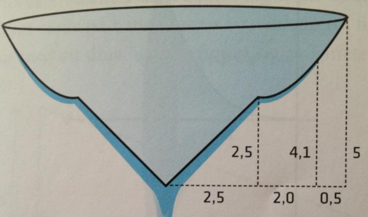 Volymen av en kon är ju , vilket med radie och höjd blir cm3.