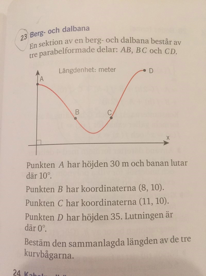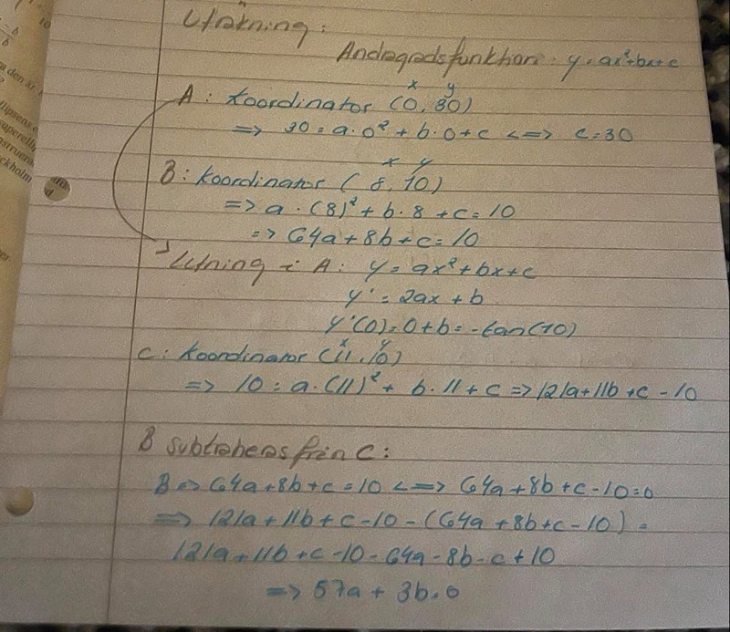 Jag var för stressad tidigare, du har åtminstone fått fram en del. Du har kommit fram till (för delen AB) att parabeln kan skrivas som y =ax2+bx+30 och att b = tan(10o) 0,1763, men du har inte tagit fram värdet på a.