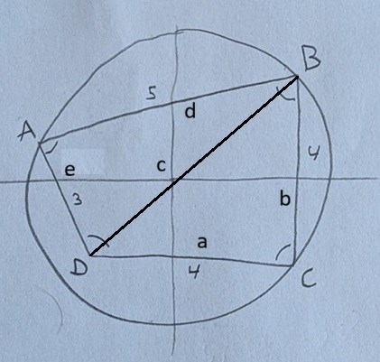 Diagonalen från B till D kallade jag för c. Den är gemensam för triangel ABD och triangel BCD.