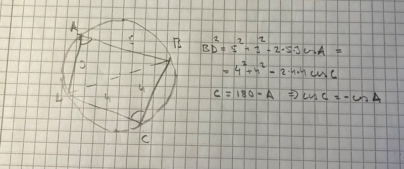 Raden "Sätter man in cos C =-cos A där får man en ekvation för cos A." var den som jag använde för att få fram att men jag kände mig osäker på om det gällde alltid av någon anledning. Så ja repetition och lite mer tid i läroböckerna behövs för att uppehålla kunskaperna.